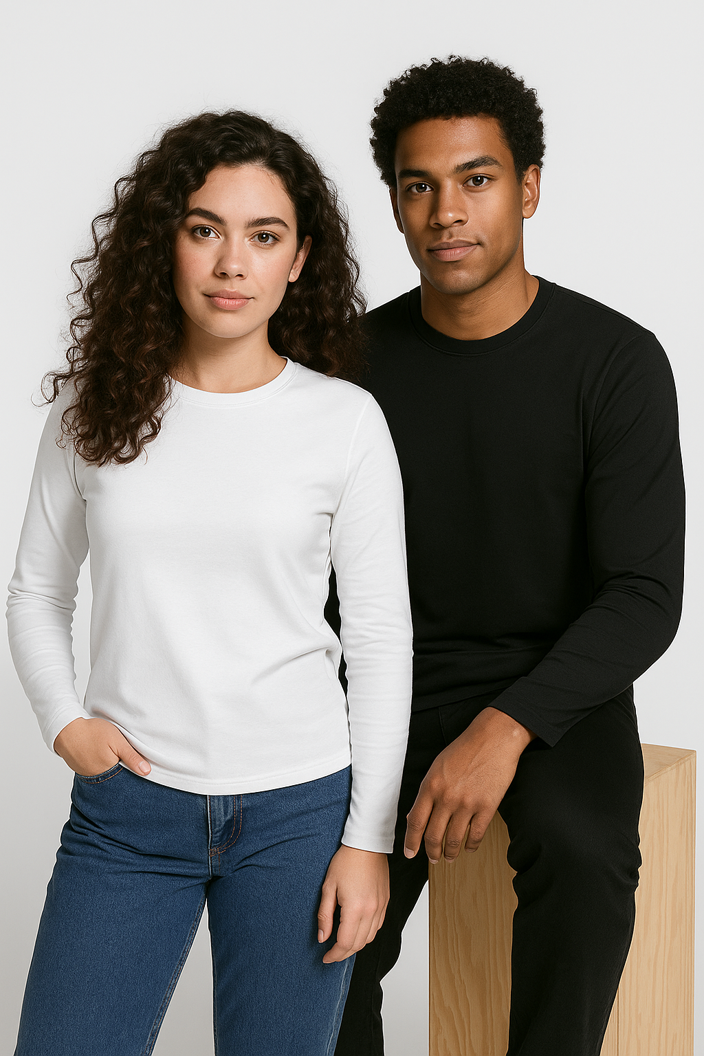 Camiseta de manga larga, tejido tubular, con cuello redondo de 4 capas y puños canalé 1x1. Cubrecosturas reforzado en cuello y hombros.